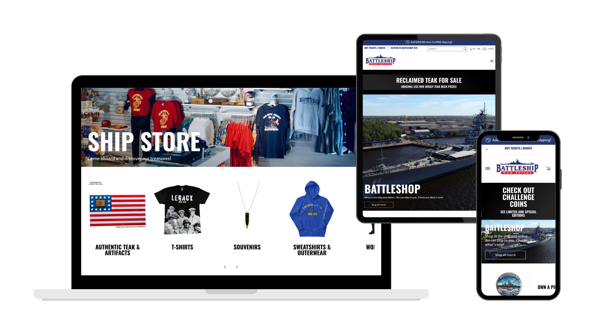 Our team helped Battleship New Jersey bring their souvenir and gift shop online through creating a new Shopify e-commerce store, branded and fully customized to seamlessly integrate with their existing WordPress site. We organized and imported their full inventory of souvenirs, apparel, accessories, coins, toys, books, drinkware, and more into tagged collections, adding and optimizing missing item details to complete the store. Upon launch, we provided staff with training for ongoing maintenance and updates. The completed e-commerce store provides an easy-to-use interface to help Battleship NJ meet their revenue and sales goals.